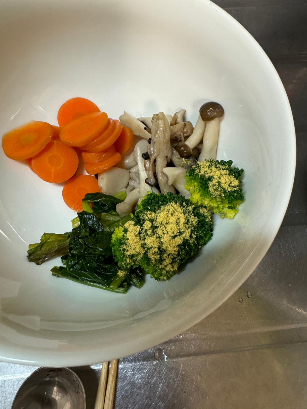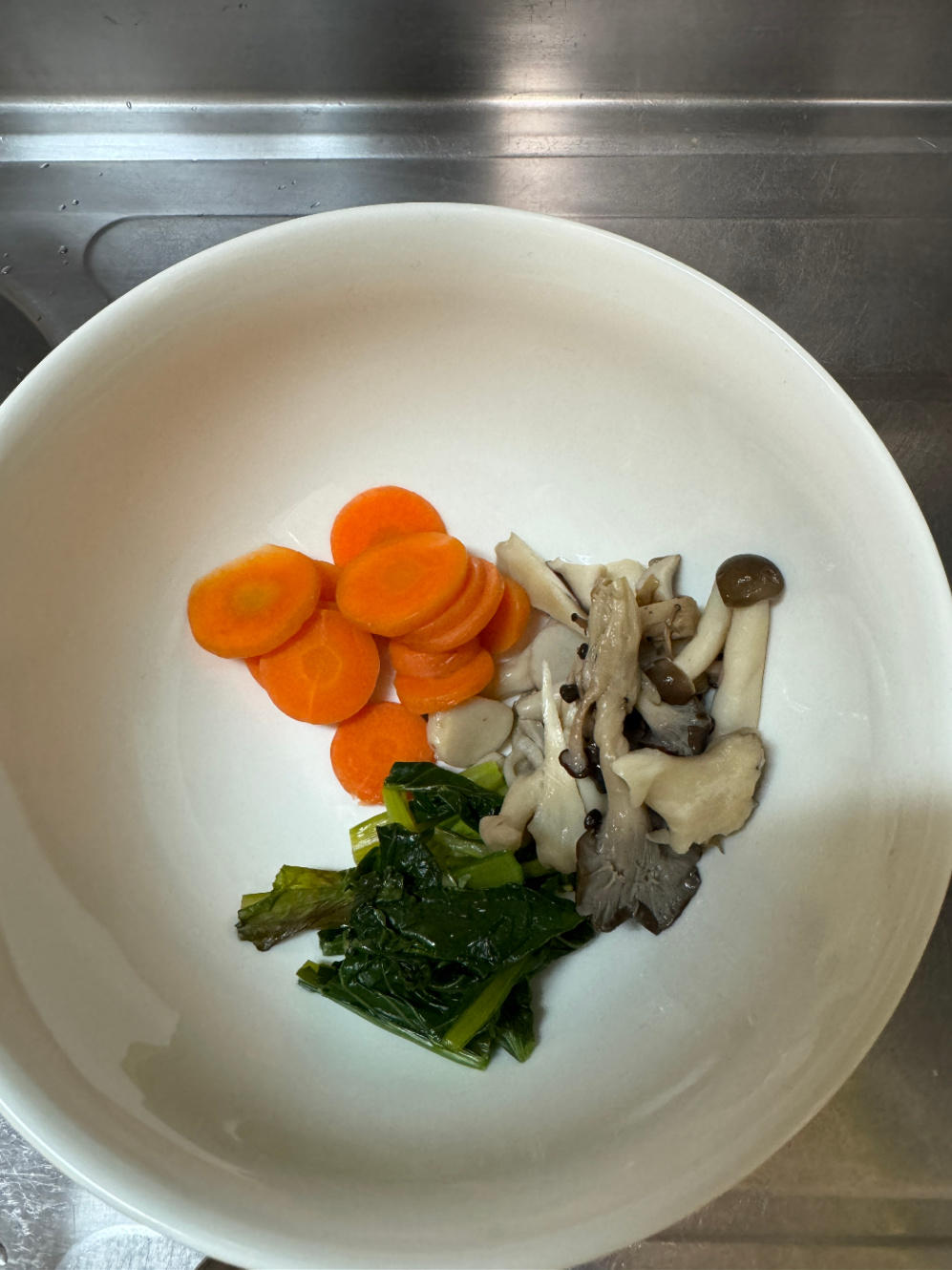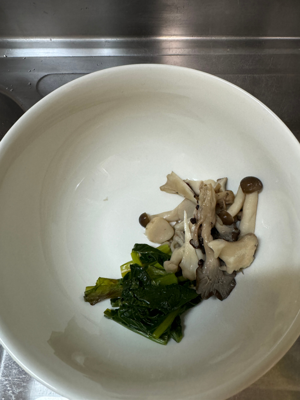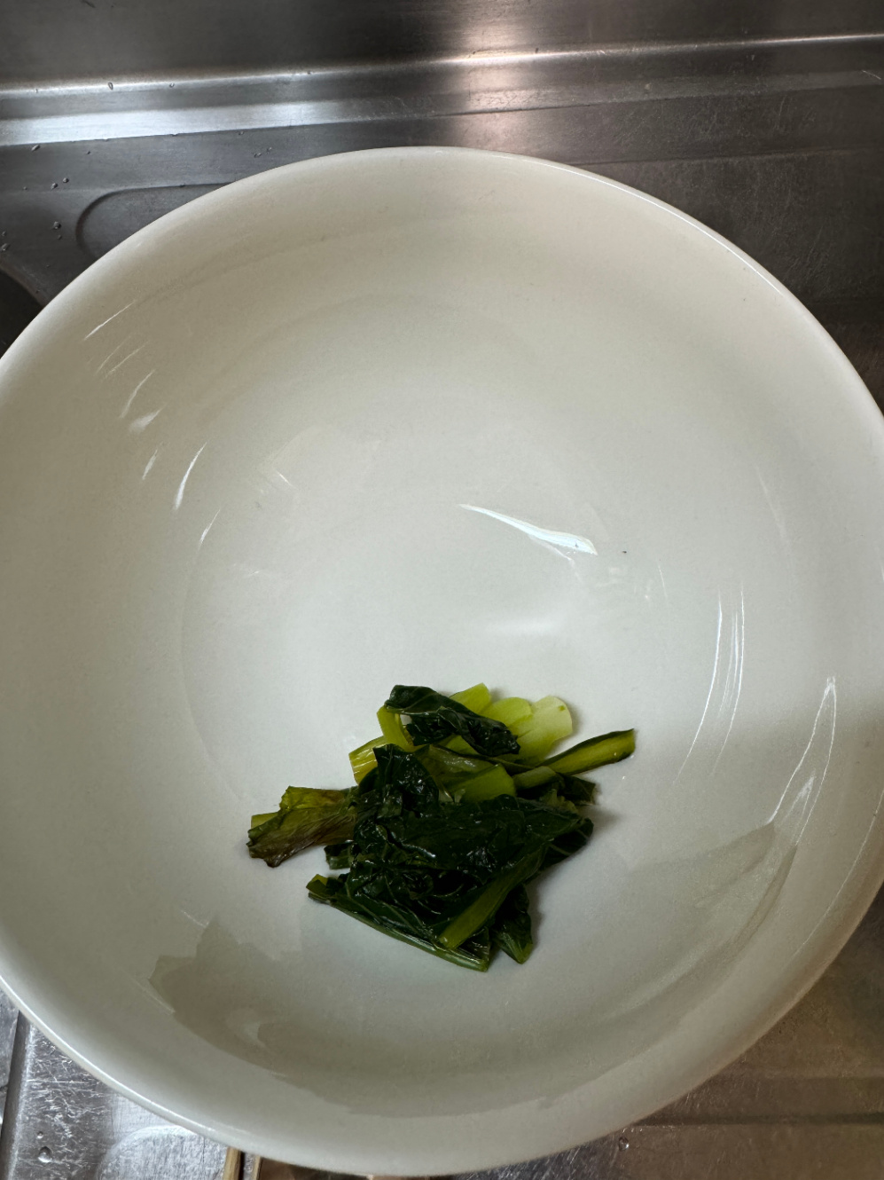 無水調理が失敗して少しこげた小松菜を入れる。